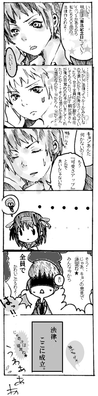 学校で猫がツンデレっていう話をしてる最中、ずーーーーーっとキョンがネコミミ姿で頭の中を登場しとりましたよ、えぇ、してました。キョンデレいいね☆今まで素直なキャラが好きだったはずなのに、いつの間に・・・!?でも学校では、古泉好きと認識。・・・あれ?