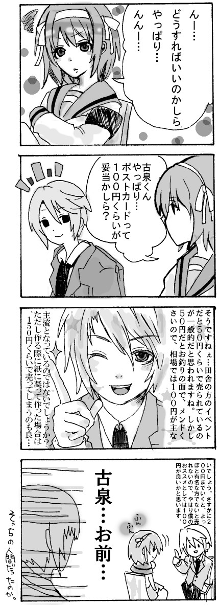 きっと古泉君は、サークル参加するハルヒのために、必死で勉強したんだと思うよ・・・っ!って、一見すると二人は合同参加!?本の値段はある程度一定だけど、グッズは作り手側によってぜんぜん違うよねっていうことを伝えたかっただけの話ですが(笑)撃沈・・・